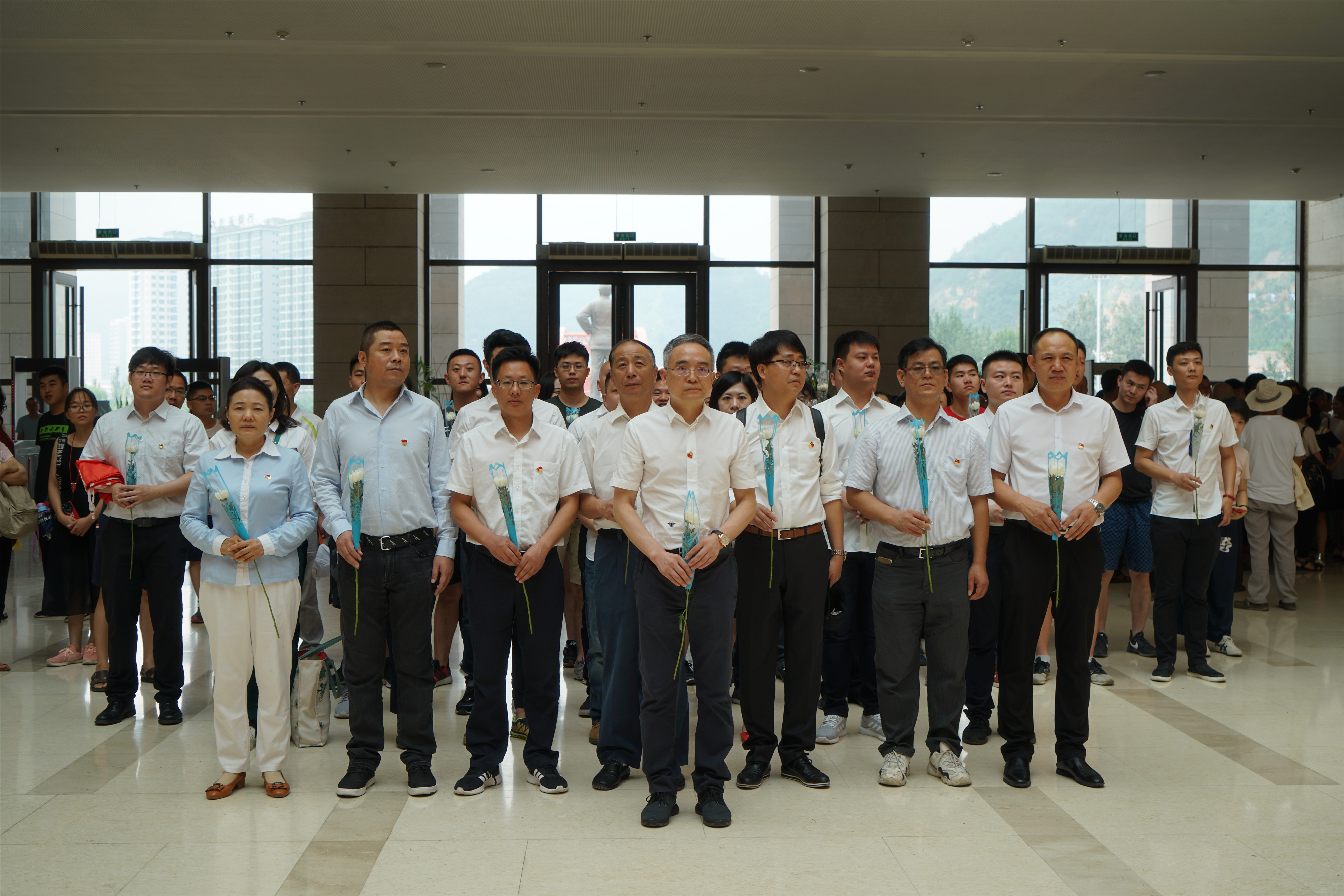 次日(7月28日)早晨,全體立豐黨員到訪延安革命紀念館,首先在紀念館廣場上與毛主席銅像合影留念。繼而走進延安革命紀念館,在紀念館工作人員的主持下,立豐所全體黨員著白襯衣、佩戴黨徽、手持鮮花整齊列隊,面向革命英雄浮雕,深深地三鞠躬,以表達對革命先烈的崇高敬意和深切懷念。緊接著,兩位立豐優(yōu)秀年輕黨員律師向革命先烈浮雕敬獻花籃,立豐黨支部書記張用江走上前掛上挽聯(lián),并仔細整理花籃緞帶。接下來,在張用江同志的帶領(lǐng)下,全體立豐黨員井然有序地依次上前敬獻鮮花。獻花禮畢,立豐黨員們各自歸位,再一次面對黨旗,在張用江同志的帶領(lǐng)下舉起右拳莊嚴宣誓,重溫入黨初心。隨后,全體黨員懷著崇敬的心情參觀了革命紀念館,重溫了我黨革命先輩的崢嶸歲月,深刻感受到革命先輩們在延安戰(zhàn)斗的艱辛,認真學(xué)習(xí)領(lǐng)會“延安精神”,全員心潮澎湃、熱血沸騰,也更加堅定了當初入黨時的那份初心。
