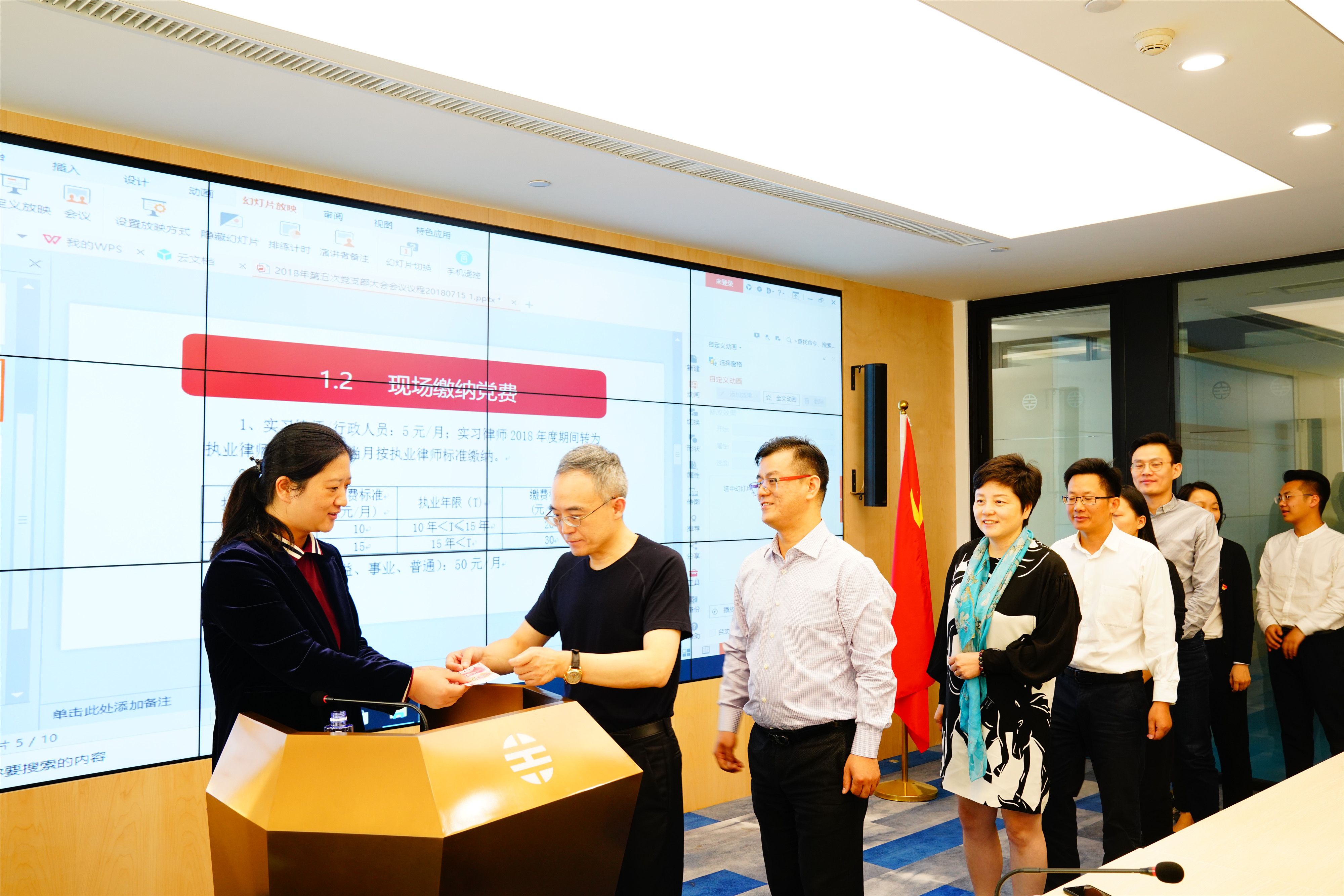 黨員大會第一項為全體與會黨員重溫入黨誓詞,全體起立,在立豐黨支部紀(jì)檢督查委員、律所管委會副主任占傳德同志的帶領(lǐng)下面對黨旗高舉右拳進(jìn)行莊嚴(yán)宣誓。宣誓完畢,全體與會立豐黨員在立豐黨支部組織統(tǒng)戰(zhàn)委員李黎同志的組織下,現(xiàn)場排隊繳納了一個月的黨費(fèi)。