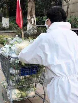中共黨員、專職律師李誠,作為志愿者,服從社區(qū)安排運(yùn)輸愛心菜到硚口區(qū)保利香檳國際小區(qū),分揀后上門為居住在小區(qū)的老人、醫(yī)生和警察家屬們發(fā)放。