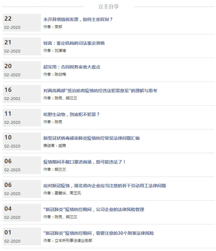 此外,針對疫情防控可能導(dǎo)致諸多法律風(fēng)險(xiǎn)問題,立豐律師開始網(wǎng)上辦公,為廣大人民群眾提供線上法律服務(wù),并自發(fā)就相關(guān)法律問題進(jìn)行專題研究,接連撰文于立豐所公眾號(hào)上推出。