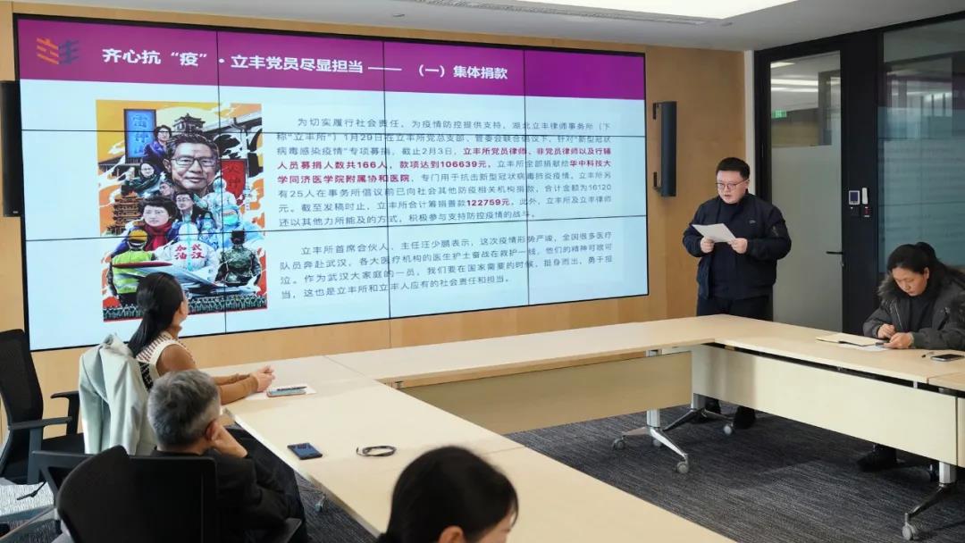 程客彬同志以《齊心抗“疫”,立豐黨員盡顯擔(dān)當(dāng)》為題,用圖文并茂的形式給大家做了生動(dòng)講述,向大家講述了在2020年抗擊新冠肺炎疫情期間,立豐律師事務(wù)所黨員律師的相關(guān)事跡。