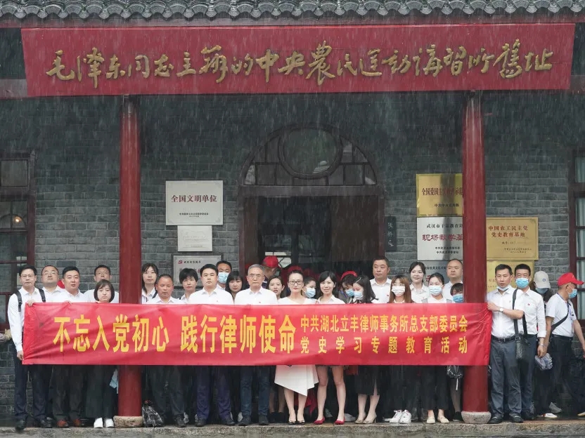 為深入貫徹落實習近平總書記在黨史學習教育動員大會上的講話精神,進一步深化拓展“不忘初心·牢記使命”專題教育,中共湖北立豐律師事務所總支部委員會(以下簡稱“立豐黨總支”)于2021年5月14日組織黨員赴武漢革命博物館,尋訪紅色足跡、聆聽黨的故事,開展“不忘入黨初心·踐行律師使命”主題黨日活動。立豐黨總支書記易卉,黨總支委員周宏力、邵華、張小瑋、何煉高、汪磊,第一黨支部書記陳迪,第二黨支部委員段斌,第三黨支部書記張璇以及各支部黨員等三十余名同志參加了本次活動。