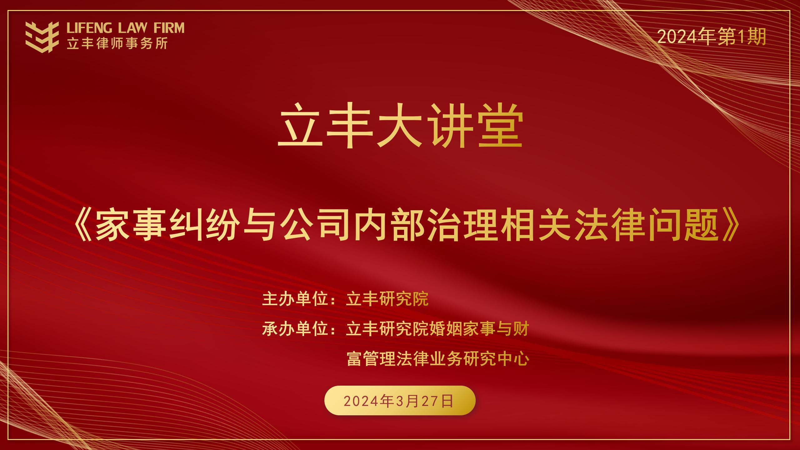 2024年3月27日14:30-17:00,由湖北立豐律師事務所研究院(以下簡稱“立豐研究院”)主辦,立豐研究院婚姻家事與財富管理法律業(yè)務研究中心承辦的2024年度第一期“立豐大講堂”在本所一號會議廳順利舉辦。本期講堂的主題為《家事糾紛與公司內部治理相關法律問題》,立豐所律師及貴州來訪交流律師團共九十余人參與了學習與交流。