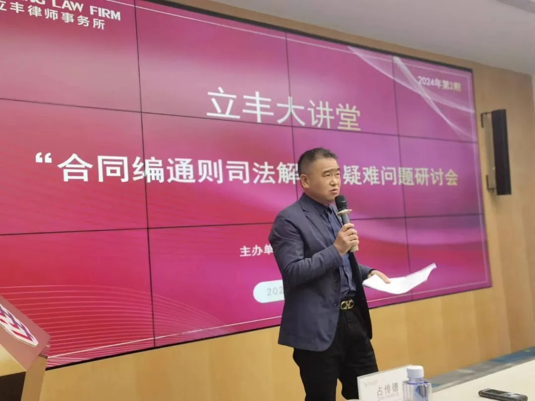 2024年4月19日下午,湖北立豐律師事務所研究院(以下簡稱“立豐研究院”)在本所一號會議廳舉辦2024年度第二期“立豐大講堂”活動。本期講堂的主題為“《民法典合同編通則司法解釋》疑難問題研討會”,北京中倫(武漢)律師事務所高級合伙人、一級律師張粒,湖北省律師協(xié)會建設工程與房地產專委會副主任、武漢城市建設集團總法律顧問、首席合規(guī)官李芊,武漢市地鐵集團的代表等多名特邀嘉賓及立豐所律師共七十余人參與了本次研討活動。