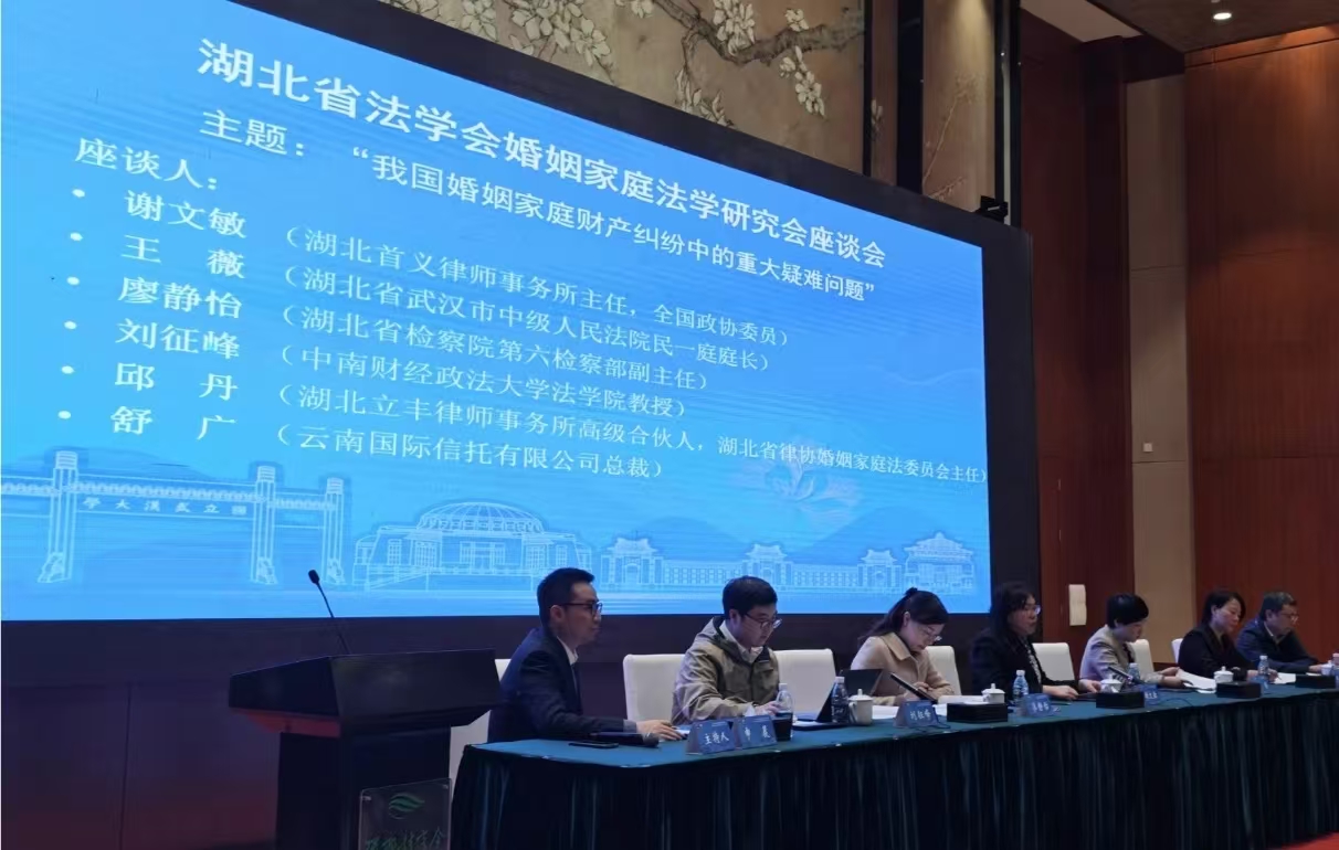 研討會(huì)正式開幕后,由全國(guó)政協(xié)委員、湖北首義律師事務(wù)所謝文敏主任、湖北省武漢市中級(jí)人民法院民一庭王薇庭長(zhǎng)、湖北省檢察院第六檢察部廖靜怡副主任、中南財(cái)經(jīng)政法大學(xué)法學(xué)院劉征峰教授、立豐所律師邱丹、云南國(guó)際信托有限公司總裁舒廣就我國(guó)婚姻家庭財(cái)產(chǎn)糾紛中的重大疑難問題進(jìn)行座談,各位嘉賓結(jié)合即將出臺(tái)的《民法典婚姻家庭編司法解釋(二)》以及各自工作中的實(shí)踐經(jīng)驗(yàn)和研究成果發(fā)表真知灼見,觀點(diǎn)碰撞。